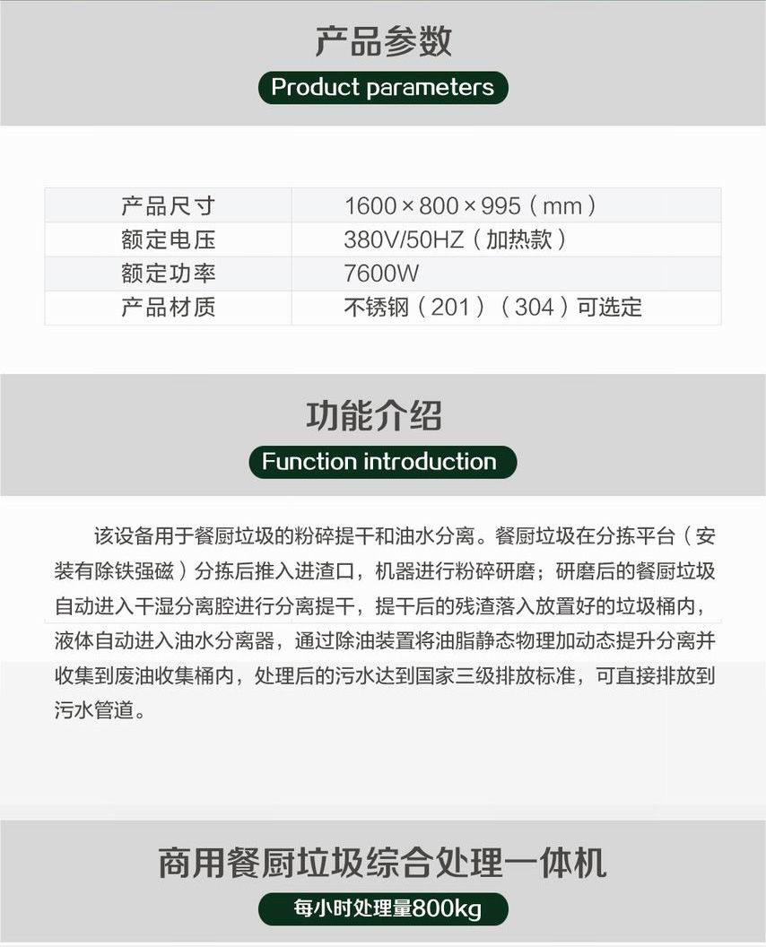 分揀后的餐廚垃圾推入進渣口,機器進行粉碎研磨;研磨后的餐廚垃圾自動進入干濕分離腔進行分離提干,提干后的殘渣落入放置好的垃圾桶內,液體自動進入油水分離器,通過除油裝置將油脂靜態物理加動態提升分離并收集到廢油收集桶內,處理后的污水達到國家三級排放標準,可直接排放到污水管道。