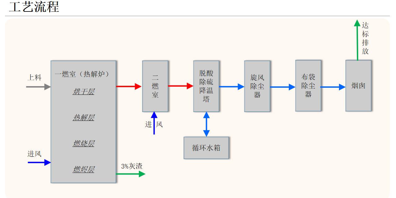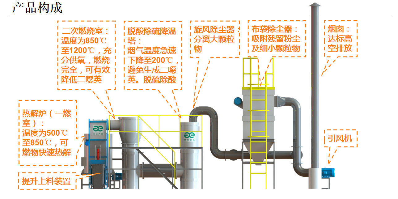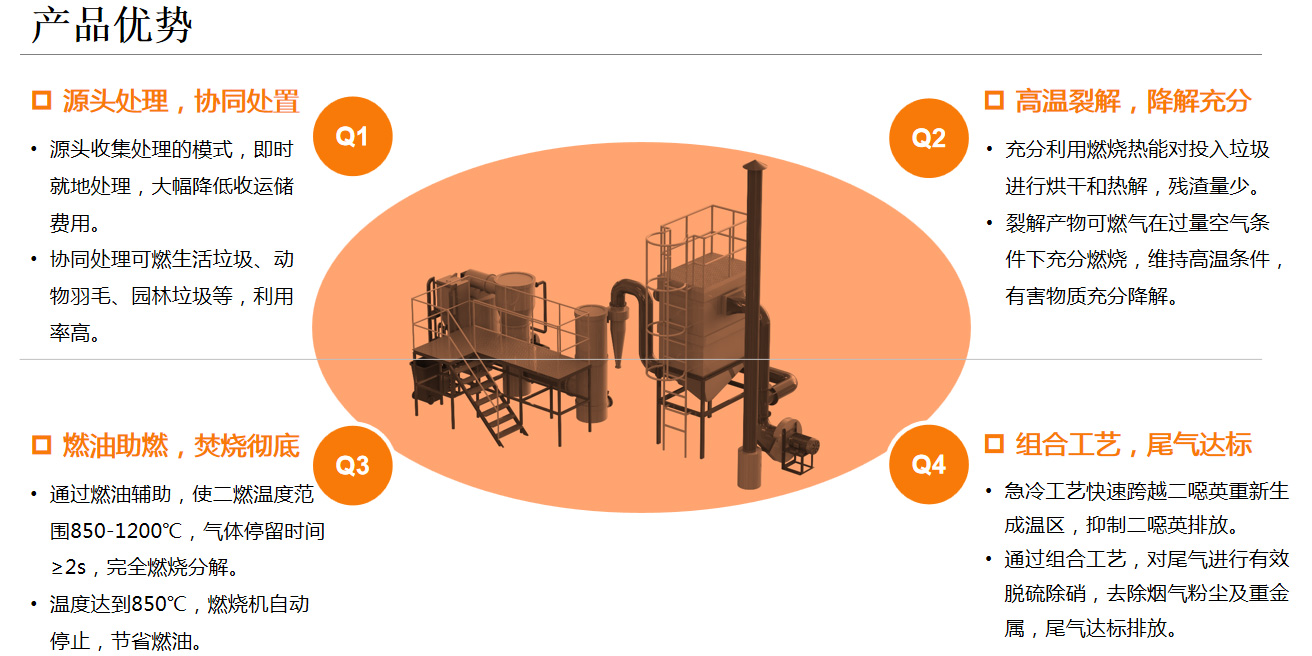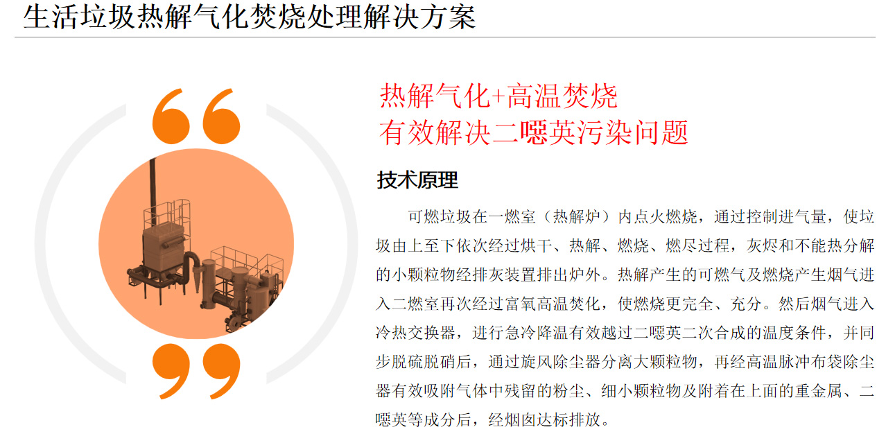 1.熱解氣化焚燒系統(tǒng)針對(duì)我國(guó)垃圾的特點(diǎn),實(shí)現(xiàn)了垃圾先熱解氣化、后富氧燃燒的二段式燃燒處理工藝。該技術(shù)在國(guó)內(nèi)是一種較為安全、經(jīng)濟(jì)的垃圾處理技術(shù)。2.由于熱解氣化的二燃室燒的是氣體,過(guò)量空氣系數(shù)較小,所以熱解法產(chǎn)生的煙氣量比直接焚燒法少,有利于煙氣的凈化,降低了二次污染的排放及治理成本。3.熱解氣化過(guò)程在低氧條件下進(jìn)行,減少了二噁英前驅(qū)體的生成,二燃室內(nèi)的溫度高達(dá)1100℃左右,且煙氣停留時(shí)間超過(guò)2s,可迅速分解二噁英類物質(zhì),使煙氣中的有害成分降低至國(guó)家排放標(biāo)準(zhǔn)規(guī)定值以下。4.系統(tǒng)煙氣凈化采用半干法脫硫吸附除塵工藝,煙氣處理效果好,不產(chǎn)生二次污染。