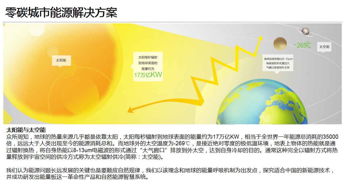 眾所周知,地球的熱量來源幾乎都是依靠太陽,太陽每秒輻射到地球表面的能量約為17萬億KW,相當于全世界一年能源總消耗的35000倍,遠遠大于人類出現至今的能源消耗總和。而地球外的太空溫度為-269℃,是接近絕對零度的極低溫環境,地表上物體的熱能就是通過輻射換熱,將自身熱能以8-13um電磁波的形式通過“大氣窗口”排放到外太空,達到自身冷卻的目的。通常這種完全以輻射方式將熱量釋放到宇宙空間的供冷方式稱為太空輻射供冷(簡稱:太空能)。